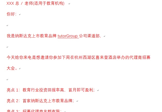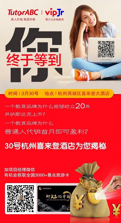 iTutorGroup在線教育集團(tuán)于2001年創(chuàng)立,是全球最大的教育集團(tuán),布局全世界80多個(gè)國(guó)家,擁有5000多位員工、超過(guò)20000名外籍顧問(wèn),每年提供3000萬(wàn)堂在線課程。ITutorGroup在全國(guó)各大城市召開(kāi)代銷會(huì),主推vipJr在線青少兒教育以及TutorABC成人在線英語(yǔ)。iTutorGroup在線教育集團(tuán)中國(guó)公司找到贏想力合作,為每次的代銷會(huì)議邀約高質(zhì)量的潛在投資者到場(chǎng)。