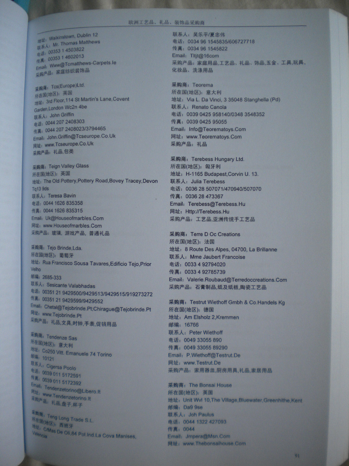 書刊簡介:《全球采商黃頁》系列叢書是由全球最活躍的專業(yè)買家及重要國際性展會的到會采購商名片信息匯編而成,包含三十多個行業(yè)分類,匯集了各類產(chǎn)品的買家信息。其中收錄的每家采購商信息均是我們通過與買家面對面的登記整理收集而成,采購意向明確,針對性強。為了確保信息的準確性和時效性,我們定期進行跟進、回訪、補充及更新工作。每家采購商信息包括國別、公司名稱、聯(lián)系人、地址、電話、傳真、電郵、網(wǎng)址、采購產(chǎn)品等詳細內(nèi)容,每冊《黃頁》約有兩千家左右的采購商信息。在當(dāng)前國際出口形勢日趨嚴峻的環(huán)境下,如何降低成本開拓國際市場,是每個出口企業(yè)急需尋找的答案,我們相信通過我們10多年的外貿(mào)信息服務(wù)經(jīng)驗和最新的國際買家資源服務(wù),將會為您拓展全球市場提供最直接有效的幫助。專業(yè)對口的買家信息一定會幫助貴公司打開更廣闊的外貿(mào)市場!