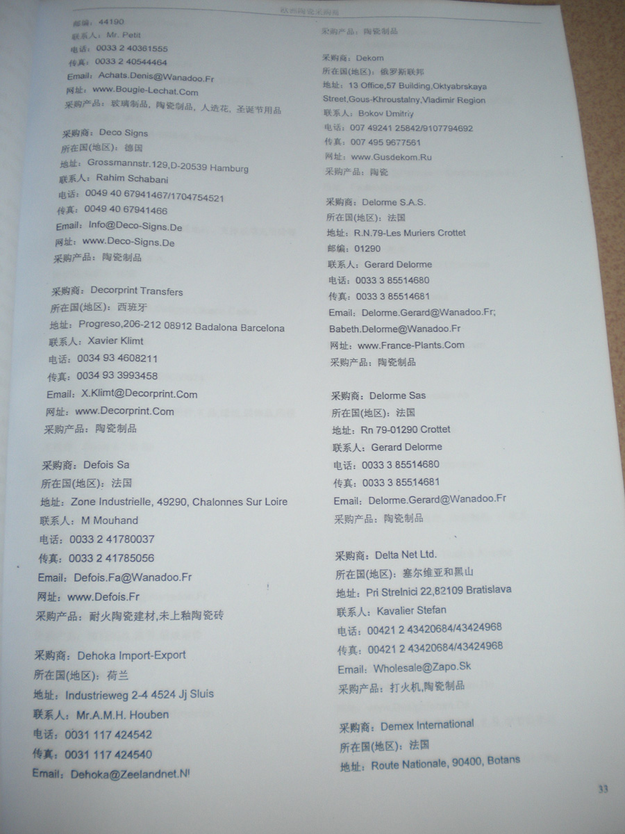 資料如何收集:在各大展會上,我們免費(fèi)向到會采購商提供他們需要的最新產(chǎn)品雜志和光盤,我們也同時向他們派發(fā)帶有我們網(wǎng)站LOGO的精美禮品,這些最新的中國供應(yīng)商的信息,對他們很有幫助,采購商會留下他們的名片,填寫詳細(xì)的產(chǎn)品求購信息,以期望得到更多的供應(yīng)商的信息。收集到這些第一手的原始外商資料后,我們客戶服務(wù)中心立刻將名片掃描作成圖片,將產(chǎn)品采購信息做成數(shù)據(jù)庫,將采購商資料按行業(yè)不同,匯編成冊,出版發(fā)行《全球采購商黃頁》系列。