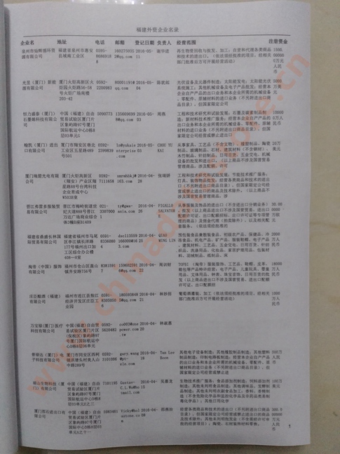 最新福建外資企業(yè)黃頁涵蓋了福建外商獨(dú)資企業(yè)、中外合資經(jīng)營企業(yè)以及港、澳、臺資企業(yè),包括福建日資臺資企業(yè)黃頁,福建外企黃頁具體內(nèi)容包括:企業(yè)名稱、地址、電話、傳真、郵箱、經(jīng)營范圍、注冊資金等信息;福建外資企業(yè)名單里面的企業(yè)都一些中外合資的大企業(yè),這些公司經(jīng)濟(jì)實(shí)力都比較雄厚,出口產(chǎn)品也比較多,業(yè)務(wù)范圍都比較廣,跟他們開展業(yè)務(wù)往來都比較容易;有了福建日企臺企黃頁開展業(yè)務(wù)也有了針對性,也省去了盲目去尋找客戶名單而浪費(fèi)的時(shí)間了,工作效率也會有很大的提高.歡迎需要的客戶及時(shí)聯(lián)系我們!