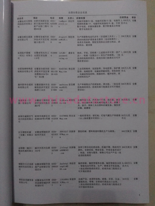 最新臺灣在大陸企業(yè)黃頁主要收錄了臺灣在大陸的獨資、合資、合作經(jīng)營等類型的企業(yè)通信黃頁,臺灣投資企業(yè)黃頁內(nèi)容有:企業(yè)名稱、地址、電話、傳真、電子郵箱、經(jīng)營范圍、注冊資金等;臺資企業(yè)黃頁都是一些國際上的知名品牌企業(yè)在大陸地區(qū)設(shè)立的分公司及辦事機構(gòu),這類企業(yè)經(jīng)濟實力、技術(shù)實力與品牌效應(yīng)都比較強,與這類企業(yè)開展合作業(yè)務(wù)是許多國內(nèi)企業(yè)夢寐以求的事情,因此在大陸臺資企業(yè)名單是各個國內(nèi)企業(yè)提高銷售業(yè)績必備的參考工具!