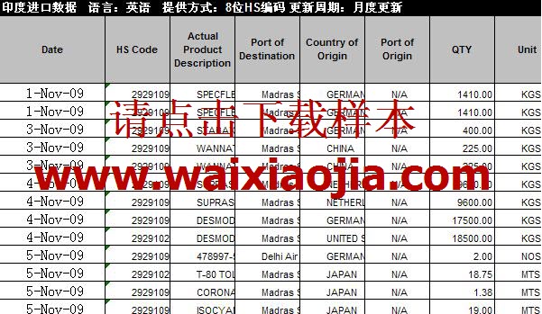 印度進口海關(guān)數(shù)據(jù)主要產(chǎn)品內(nèi)容包括: 進口商公司名稱、進口單價、進口總價、 H.S 編碼、產(chǎn)品描述、進口日期、進口數(shù)量、數(shù)量單位、原產(chǎn)國、運輸方式。