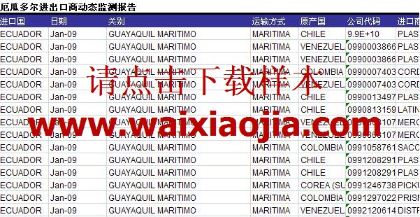 厄瓜多爾進(jìn)口關(guān)單數(shù)據(jù),以厄瓜多爾本土企業(yè)向全球 200 多個(gè)國(guó)家和地區(qū)進(jìn)口各類商品的進(jìn)口申報(bào)單證為依據(jù)。按照具體產(chǎn)品的精確 HS 編碼提供。 數(shù)據(jù)內(nèi)容包括:進(jìn)口國(guó)、日期、關(guān)別、運(yùn)輸方式、原產(chǎn)國(guó)、公司代碼、進(jìn)口商名稱、進(jìn)口商地址、海關(guān)編碼、產(chǎn)品描述、計(jì)量單位、運(yùn)費(fèi)、倉(cāng)單號(hào)碼、 FOB 單價(jià)、 總金額、總凈重、總毛重、 FOB 總值、 CIF 總值、 海關(guān)總值等核心情報(bào)信息。