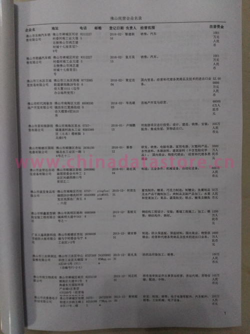2021版最新佛山企業(yè)黃頁包括《佛山制造企業(yè)黃頁》、《佛山貿(mào)易企業(yè)黃頁》、《佛山民營企業(yè)黃頁》、《佛山外資企業(yè)黃頁》、《佛山外貿(mào)企業(yè)黃頁》共五冊,現(xiàn)優(yōu)惠價:280元/冊。每冊內(nèi)容包括:單位名稱、地址、郵編、電話、傳真、郵箱、經(jīng)營范圍等;佛山企業(yè)黃頁涵蓋了近幾年來最新成立的、有一定規(guī)模的企業(yè),具有非常高的營銷價值。有了這套黃頁開展業(yè)務(wù)也有了針對性,也省去了盲目去尋找客戶名單而浪費的時間了,工作效率也會有很大的提高。歡迎需要佛山企業(yè)黃頁的朋友及時聯(lián)系我們!