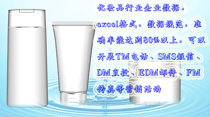 最新化妝品生產(chǎn)與貿(mào)易企業(yè)黃頁數(shù)據(jù)更新日期2024年12月最新,全國化妝品企業(yè)黃頁共66000條,都是具有一定規(guī)模的化妝品行業(yè)的注冊實(shí)體企業(yè),數(shù)據(jù)準(zhǔn)確率高,是您開展各項(xiàng)營銷活動的必備資料。企業(yè)名單包括:企業(yè)名稱、地址、電話(以上必有,以下選有)、傳真、郵箱、登記日期、經(jīng)營范圍、注冊資金等信息?;瘖y品企業(yè)黃頁數(shù)據(jù)為Excel格式,信息可任意修改、復(fù)制、打印、導(dǎo)出及導(dǎo)入到傳真、郵件群發(fā)等軟件中,無任何限制。