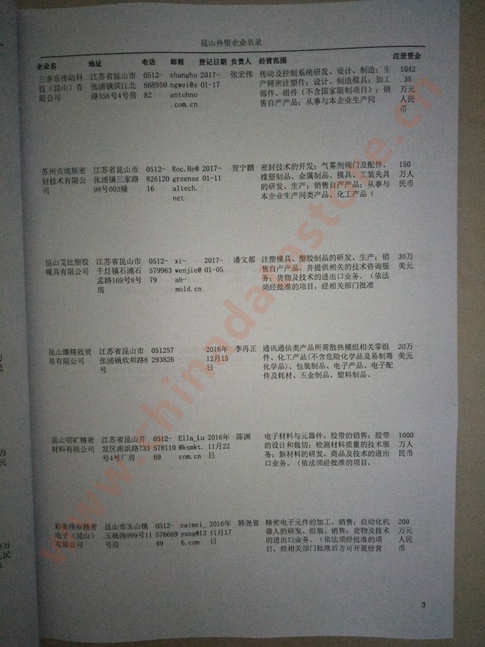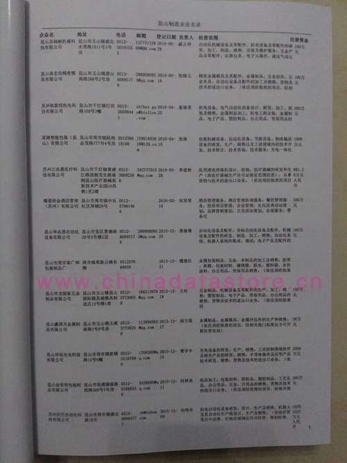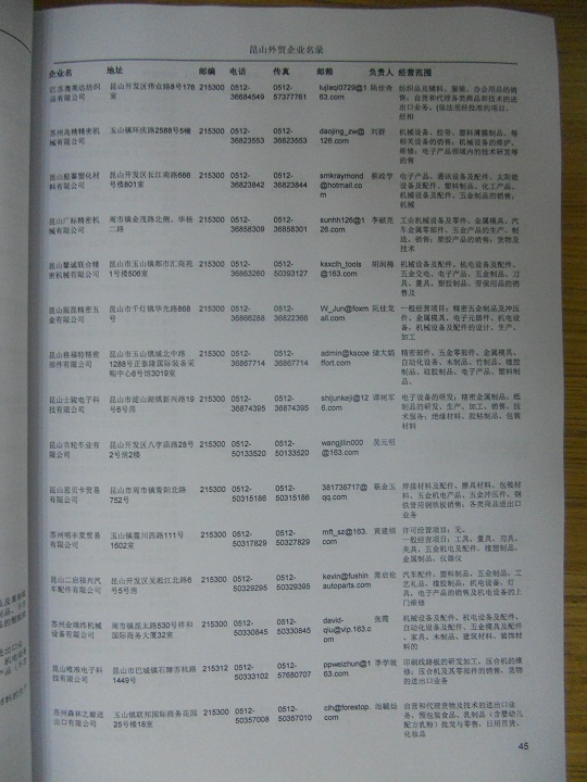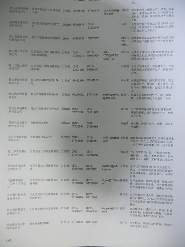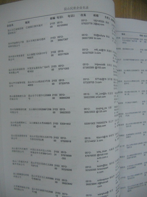 2021版最新昆山企業(yè)黃頁包括《昆山制造企業(yè)黃頁》、《昆山貿(mào)易企業(yè)黃頁》、《昆山民營企業(yè)黃頁》、《昆山外資企業(yè)黃頁》、《昆山外貿(mào)企業(yè)黃頁》共五冊,現(xiàn)優(yōu)惠價:280元/冊。每冊內(nèi)容包括:單位名稱、地址、郵編、電話、傳真、郵箱、經(jīng)營范圍等;昆山企業(yè)黃頁涵蓋了近幾年來最新成立的、有一定規(guī)模的企業(yè),具有非常高的營銷價值。有了這套黃頁開展業(yè)務(wù)也有了針對性,也省去了盲目去尋找客戶名單而浪費的時間了,工作效率也會有很大的提高。歡迎需要昆山企業(yè)黃頁的朋友及時聯(lián)系我們!