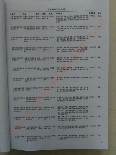 2024年新版中國(guó)建材采購(gòu)企業(yè)黃頁(yè),收錄了全國(guó)各地經(jīng)營(yíng)范圍涉及建材產(chǎn)品的貿(mào)易企業(yè),這些都是頗具實(shí)力的建材產(chǎn)品的中國(guó)采購(gòu)商。黃頁(yè)內(nèi)容包含:企業(yè)名稱(chēng)、地址、電話(huà)、傳真、郵箱、經(jīng)營(yíng)范圍、省份、注冊(cè)資金等信息。該套黃頁(yè)包含一個(gè)黃頁(yè)光碟加一冊(cè)紙質(zhì)書(shū)刊,全國(guó)價(jià)格:1500元,省/直轄市價(jià)格:400元,城市價(jià)格:200元,共收錄了全國(guó)各地大概111371(統(tǒng)計(jì)日期:2018.1)家建材產(chǎn)品采購(gòu)企業(yè)。黃頁(yè)光碟中是EXCEL格式,信息可任意修改、復(fù)制、打印、導(dǎo)出及導(dǎo)入到傳真、郵件群發(fā)等軟件中,無(wú)任何限制。