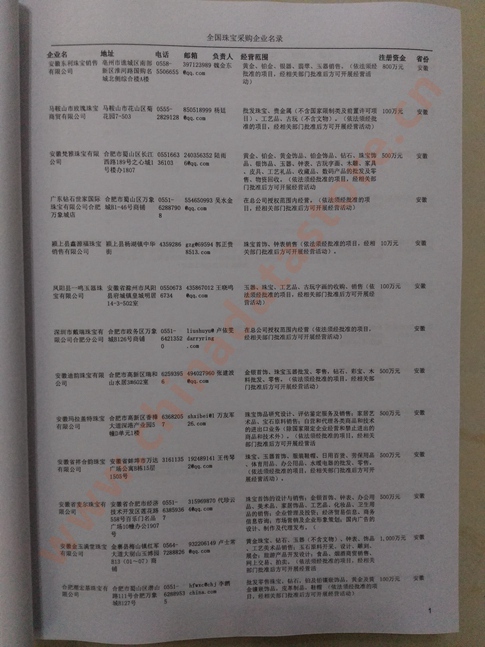 2024年新版中國珠寶采購企業(yè)黃頁,收錄了全國各地經(jīng)營范圍涉及珠寶產(chǎn)品的貿(mào)易企業(yè),這些都是頗具實(shí)力的珠寶產(chǎn)品的中國采購商。黃頁內(nèi)容包含:企業(yè)名稱、地址、電話、傳真、郵箱、經(jīng)營范圍、省份、注冊(cè)資金等信息。該套黃頁包含一個(gè)黃頁光碟加一冊(cè)紙質(zhì)書刊,全國價(jià)格:1500元,省/直轄市價(jià)格:400元,城市價(jià)格:200元,共收錄了全國各地大概44763(統(tǒng)計(jì)日期:2018.1)家珠寶產(chǎn)品采購企業(yè)。黃頁光碟中是EXCEL格式,信息可任意修改、復(fù)制、打印、導(dǎo)出及導(dǎo)入到傳真、郵件群發(fā)等軟件中,無任何限制。