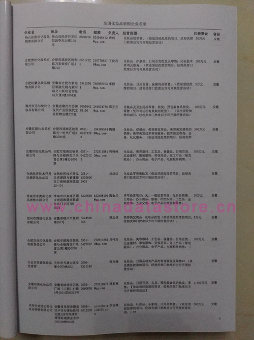 2024年新版中國(guó)化妝品采購(gòu)企業(yè)黃頁(yè),收錄了全國(guó)各地經(jīng)營(yíng)范圍涉及化妝品產(chǎn)品的貿(mào)易企業(yè),這些都是頗具實(shí)力的化妝品產(chǎn)品的中國(guó)采購(gòu)商。黃頁(yè)內(nèi)容包含:企業(yè)名稱、地址、電話、傳真、郵箱、經(jīng)營(yíng)范圍、省份、注冊(cè)資金等信息。該套黃頁(yè)包含一個(gè)黃頁(yè)光碟加一冊(cè)紙質(zhì)書刊,全國(guó)價(jià)格:1500元,省/直轄市價(jià)格:400元,城市價(jià)格:200元,共收錄了全國(guó)各地大概28010(統(tǒng)計(jì)日期:2018.1)家化妝品產(chǎn)品采購(gòu)企業(yè)。黃頁(yè)光碟中是EXCEL格式,信息可任意修改、復(fù)制、打印、導(dǎo)出及導(dǎo)入到傳真、郵件群發(fā)等軟件中,無任何限制。