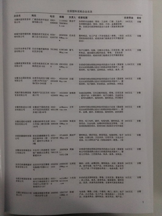 2024年新版中國塑料采購企業(yè)黃頁,收錄了全國各地經(jīng)營范圍涉及塑料產(chǎn)品的貿(mào)易企業(yè),這些都是頗具實(shí)力的塑料產(chǎn)品的中國采購商。黃頁內(nèi)容包含:企業(yè)名稱、地址、電話、傳真、郵箱、經(jīng)營范圍、省份、注冊(cè)資金等信息。該套黃頁包含一個(gè)黃頁光碟加一冊(cè)紙質(zhì)書刊,全國價(jià)格:1500元元,省/直轄市價(jià)格:400元,城市價(jià)格:200元,共收錄了全國各地大概6700(統(tǒng)計(jì)日期:2018.1)家塑料產(chǎn)品采購企業(yè)。。黃頁光碟中是EXCEL格式,信息可任意修改、復(fù)制、打印、導(dǎo)出及導(dǎo)入到傳真、郵件群發(fā)等軟件中,無任何限制。