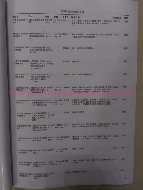 2024年新版中國陶瓷采購企業(yè)黃頁,收錄了全國各地經(jīng)營范圍涉及陶瓷產(chǎn)品的貿(mào)易企業(yè),這些都是頗具實(shí)力的陶瓷產(chǎn)品的中國采購商。黃頁內(nèi)容包含:企業(yè)名稱、地址、電話、傳真、郵箱、經(jīng)營范圍、省份、注冊資金等信息。該套黃頁包含一個黃頁光碟加一冊紙質(zhì)書刊,,全國價格:1500元,省/直轄市價格:400元,城市價格:200元,共收錄了全國各地大概10500(統(tǒng)計日期:2018.1)家陶瓷產(chǎn)品采購企業(yè)。黃頁光碟中是EXCEL格式,信息可任意修改、復(fù)制、打印、導(dǎo)出及導(dǎo)入到傳真、郵件群發(fā)等軟件中,無任何限制。