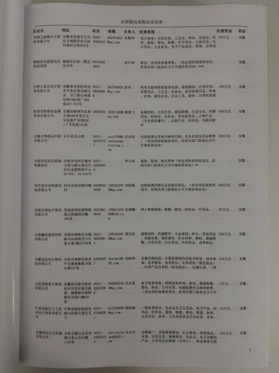 2024年新版中國箱包采購企業(yè)黃頁,收錄了全國各地經(jīng)營范圍涉及箱包產(chǎn)品的貿(mào)易企業(yè),這些都是頗具實力的箱包產(chǎn)品的中國采購商。黃頁內(nèi)容包含:企業(yè)名稱、地址、電話、傳真、郵箱、經(jīng)營范圍、省份、注冊資金等信息。該套黃頁包含一個黃頁光碟加一冊紙質(zhì)書刊,全國價格:1500元,省/直轄市價格:400元,城市價格:200元,共收錄了全國各地大概2542(統(tǒng)計日期:2018.1)家箱包產(chǎn)品采購企業(yè)。黃頁光碟中是EXCEL格式,信息可任意修改、復(fù)制、打印、導(dǎo)出及導(dǎo)入到傳真、郵件群發(fā)等軟件中,無任何限制。