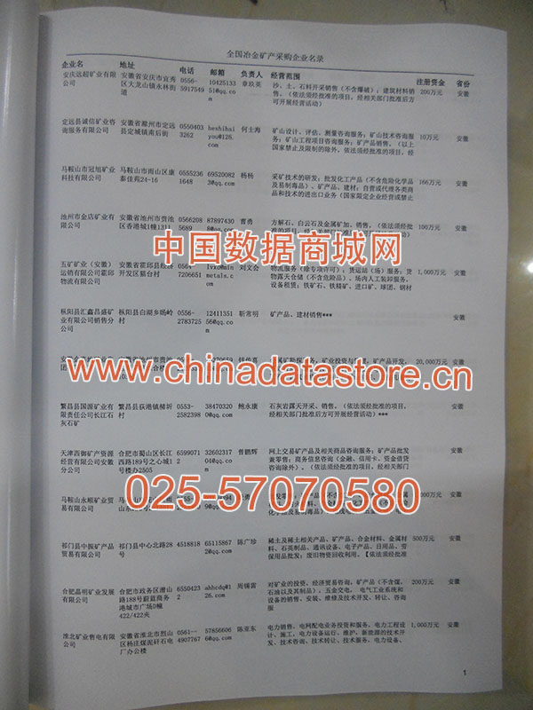 2024年新版中國冶金礦產(chǎn)采購企業(yè)黃頁,收錄了全國各地經(jīng)營范圍涉及冶金礦產(chǎn)產(chǎn)品的貿(mào)易企業(yè),這些都是頗具實力的冶金礦產(chǎn)產(chǎn)品的中國采購商。黃頁內(nèi)容包含:企業(yè)名稱、地址、電話、傳真、郵箱、經(jīng)營范圍、省份、注冊資金等信息。該套黃頁包含一個黃頁光碟加一冊紙質(zhì)書刊,全國價格:1500元,省/直轄市價格:400元,城市價格:200元,共收錄了全國各地大概8042(統(tǒng)計日期:2018.1)家冶金礦產(chǎn)產(chǎn)品采購企業(yè)。黃頁光碟中是EXCEL格式,信息可任意修改、復(fù)制、打印、導(dǎo)出及導(dǎo)入到傳真、郵件群發(fā)等軟件中,無任何限制。
