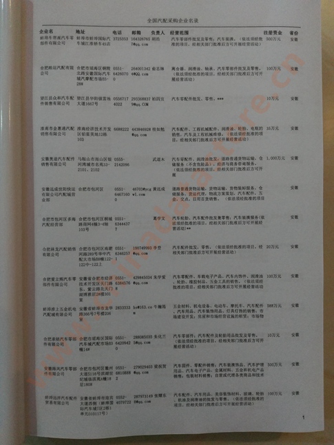 2024年新版中國汽配采購企業(yè)黃頁,收錄了全國各地經(jīng)營范圍涉及汽配產(chǎn)品的貿(mào)易企業(yè),這些都是頗具實力的汽配產(chǎn)品的中國采購商。黃頁內(nèi)容包含:企業(yè)名稱、地址、電話、傳真、郵箱、經(jīng)營范圍、省份、注冊資金等信息。該套黃頁包含一個黃頁光碟加一冊紙質(zhì)書刊,全國價格:1500元,省/直轄市價格:400元,城市價格:200元,共收錄了全國各地大概8952(統(tǒng)計日期:2018.1)家汽配產(chǎn)品采購企業(yè)。黃頁光碟中是EXCEL格式,信息可任意修改、復制、打印、導出及導入到傳真、郵件群發(fā)等軟件中,無任何限制。