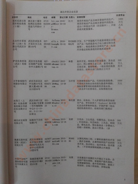 最新湖北外資企業(yè)黃頁涵蓋了湖北外商獨資企業(yè)、中外合資經(jīng)營企業(yè)以及港、澳、臺資企業(yè),包括湖北臺資日資企業(yè)黃頁,湖北外企黃頁具體內(nèi)容包括:企業(yè)名稱、地址、電話、傳真、郵箱、經(jīng)營范圍、注冊資金等信息;湖北外資企業(yè)名單里面的企業(yè)都一些中外合資的大企業(yè),這些公司經(jīng)濟實力都比較雄厚,出口產(chǎn)品也比較多,業(yè)務(wù)范圍都比較廣,跟他們開展業(yè)務(wù)往來都比較容易;有了湖北臺企日企黃頁開展業(yè)務(wù)也有了針對性,也省去了盲目去尋找客戶名單而浪費的時間了,工作效率也會有很大的提高.歡迎需要的客戶及時聯(lián)系我們!