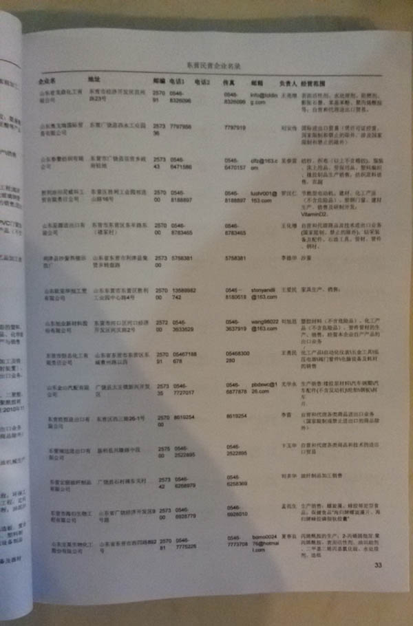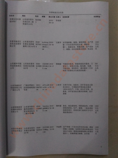 2021版最新東營企業(yè)黃頁包括《東營制造企業(yè)黃頁》、《東營民營企業(yè)黃頁》,現(xiàn)優(yōu)惠價(jià):280元/冊。每冊內(nèi)容包括:單位名稱、地址、郵編、電話、傳真、郵箱、經(jīng)營范圍等;東營企業(yè)黃頁涵蓋了近幾年來最新成立的、有一定規(guī)模的企業(yè),具有非常高的營銷價(jià)值。有了這套黃頁開展業(yè)務(wù)也有了針對性,也省去了盲目去尋找客戶名單而浪費(fèi)的時(shí)間了,工作效率也會有很大的提高。歡迎需要東營企業(yè)黃頁的朋友及時(shí)聯(lián)系我們!