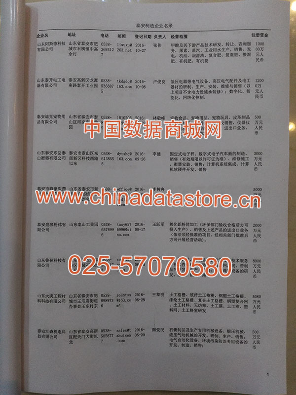 2021版最新泰安企業(yè)黃頁包括《泰安制造企業(yè)黃頁》、《泰安民營企業(yè)黃頁》,現(xiàn)優(yōu)惠價(jià):280元/冊。每冊內(nèi)容包括:單位名稱、地址、郵編、電話、傳真、郵箱、經(jīng)營范圍等;泰安企業(yè)黃頁涵蓋了近幾年來最新成立的、有一定規(guī)模的企業(yè),具有非常高的營銷價(jià)值。有了這套黃頁開展業(yè)務(wù)也有了針對性,也省去了盲目去尋找客戶名單而浪費(fèi)的時(shí)間了,工作效率也會有很大的提高。歡迎需要泰安企業(yè)黃頁的朋友及時(shí)聯(lián)系我們!