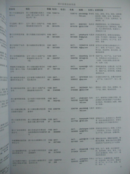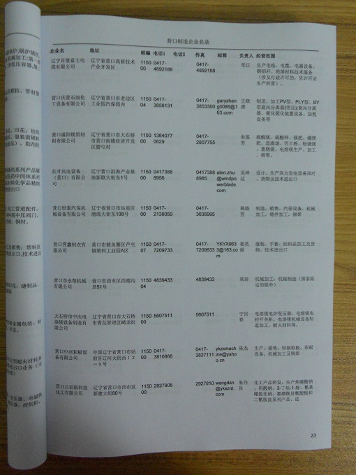 2021版最新營口企業(yè)黃頁包括《營口制造企業(yè)黃頁》、《營口民營企業(yè)黃頁》,現(xiàn)優(yōu)惠價(jià):280元/冊。每冊內(nèi)容包括:單位名稱、地址、郵編、電話、傳真、郵箱、經(jīng)營范圍等;營口企業(yè)黃頁涵蓋了近幾年來最新成立的、有一定規(guī)模的企業(yè),具有非常高的營銷價(jià)值。有了這套黃頁開展業(yè)務(wù)也有了針對(duì)性,也省去了盲目去尋找客戶名單而浪費(fèi)的時(shí)間了,工作效率也會(huì)有很大的提高。歡迎需要營口企業(yè)黃頁的朋友及時(shí)聯(lián)系我們!