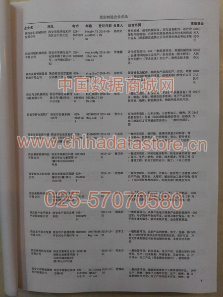2021版最新西安企業(yè)黃頁包括《西安制造企業(yè)黃頁》、《西安民營企業(yè)黃頁》,現(xiàn)優(yōu)惠價:280元/冊。每冊內(nèi)容包括:單位名稱、地址、郵編、電話、傳真、郵箱、經(jīng)營范圍等;西安企業(yè)黃頁涵蓋了近幾年來最新成立的、有一定規(guī)模的企業(yè),具有非常高的營銷價值。有了這套黃頁開展業(yè)務(wù)也有了針對性,也省去了盲目去尋找客戶名單而浪費的時間了,工作效率也會有很大的提高。歡迎需要西安企業(yè)黃頁的朋友及時聯(lián)系我們!