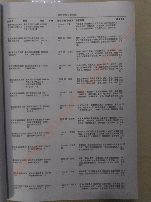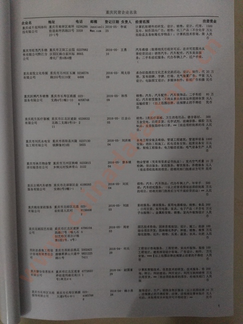 2021版最新重慶企業(yè)黃頁包括《重慶制造企業(yè)黃頁》、《重慶民營企業(yè)黃頁》,現(xiàn)優(yōu)惠價:280元/冊。每冊內(nèi)容包括:單位名稱、地址、郵編、電話、傳真、郵箱、經(jīng)營范圍等;重慶企業(yè)黃頁涵蓋了近幾年來最新成立的、有一定規(guī)模的企業(yè),具有非常高的營銷價值。有了這套黃頁開展業(yè)務(wù)也有了針對性,也省去了盲目去尋找客戶名單而浪費的時間了,工作效率也會有很大的提高。歡迎需要重慶企業(yè)黃頁的朋友及時聯(lián)系我們!