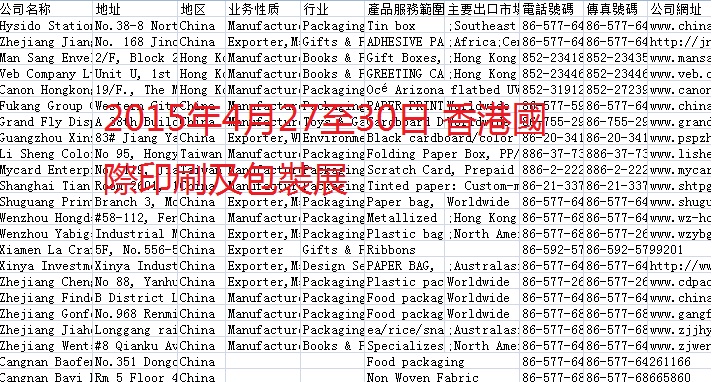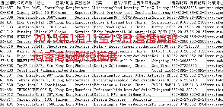 簡(jiǎn)介:2015年香港貿(mào)發(fā)局展會(huì)會(huì)刊共收錄28個(gè)展會(huì)參展商信息。數(shù)據(jù)格式EXCEL,會(huì)刊內(nèi)容包含:公司名稱(chēng)、地址、地區(qū)、業(yè)務(wù)性質(zhì)、行業(yè)、產(chǎn)品服務(wù)范圍、出口市場(chǎng)、電話、傳真、網(wǎng)址。