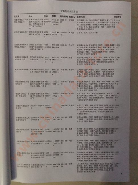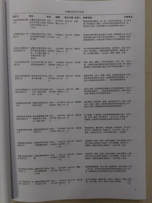 2021版最新安徽企業(yè)黃頁(yè)包括《安徽制造企業(yè)黃頁(yè)》、《安徽貿(mào)易企業(yè)黃頁(yè)》、《安徽民營(yíng)企業(yè)黃頁(yè)》共三冊(cè),優(yōu)惠價(jià):280元/冊(cè)。每?jī)?cè)內(nèi)容包括:?jiǎn)挝幻Q、地址、郵編、電話、傳真、郵箱、經(jīng)營(yíng)范圍等;安徽企業(yè)黃頁(yè)涵蓋了近幾年來(lái)最新成立的、有一定規(guī)模的企業(yè),具有非常高的營(yíng)銷價(jià)值。有了這套黃頁(yè)開展業(yè)務(wù)也有了針對(duì)性,也省去了盲目去尋找客戶名單而浪費(fèi)的時(shí)間了,工作效率也會(huì)有很大的提高。歡迎需要安徽企業(yè)黃頁(yè)的朋友及時(shí)聯(lián)系我們!