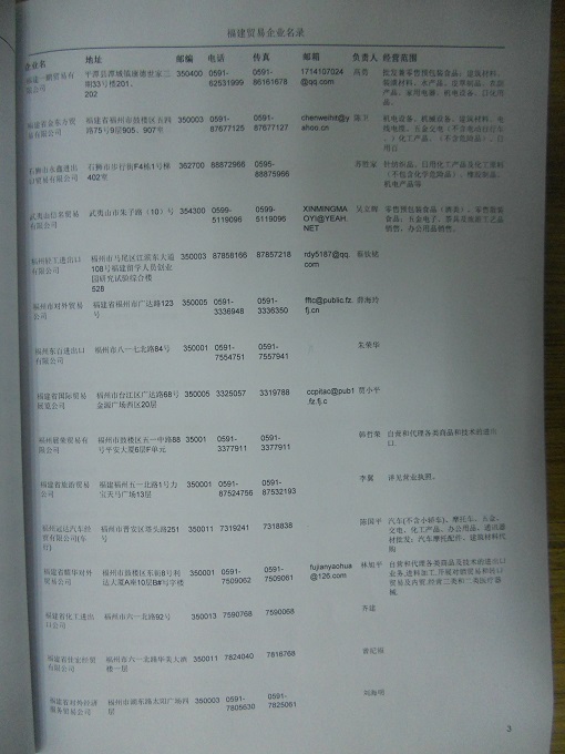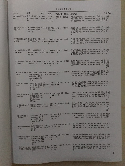 2021版最新福建企業(yè)黃頁(yè)包括《福建制造企業(yè)黃頁(yè)》、《福建貿(mào)易企業(yè)黃頁(yè)》、《福建民營(yíng)企業(yè)黃頁(yè)》共三冊(cè),優(yōu)惠價(jià):280元/冊(cè)。每?jī)?cè)內(nèi)容包括:?jiǎn)挝幻Q、地址、郵編、電話、傳真、郵箱、經(jīng)營(yíng)范圍等;福建企業(yè)黃頁(yè)涵蓋了近幾年來(lái)最新成立的、有一定規(guī)模的企業(yè),具有非常高的營(yíng)銷價(jià)值。有了這套黃頁(yè)開(kāi)展業(yè)務(wù)也有了針對(duì)性,也省去了盲目去尋找客戶名單而浪費(fèi)的時(shí)間了,工作效率也會(huì)有很大的提高。歡迎需要福建企業(yè)黃頁(yè)的朋友及時(shí)聯(lián)系我們!
