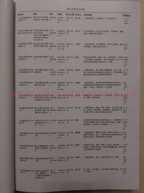 浙江外貿(mào)企業(yè)黃頁(yè)包括:外貿(mào)企業(yè)名稱、地址、電話、傳真、郵箱、經(jīng)營(yíng)范圍、注冊(cè)資金等信息。