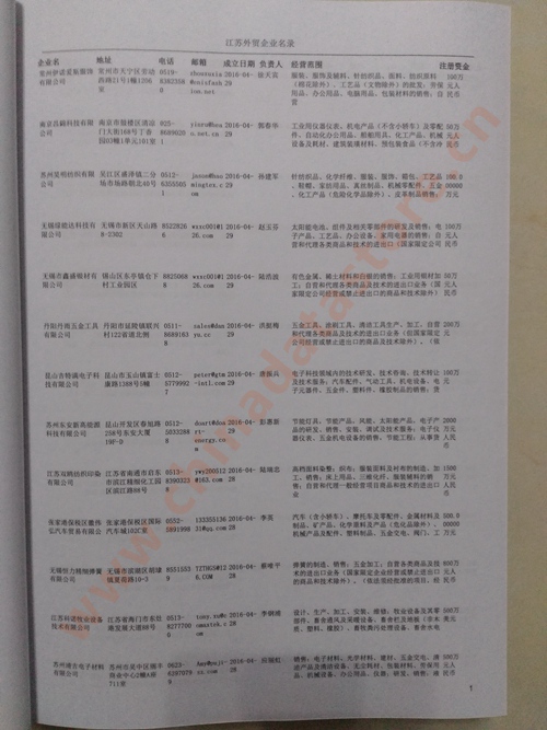 江蘇外貿(mào)企業(yè)黃頁(yè)包括:外貿(mào)企業(yè)名稱(chēng)、地址、電話(huà)、傳真、郵箱、經(jīng)營(yíng)范圍、注冊(cè)資金等信息。