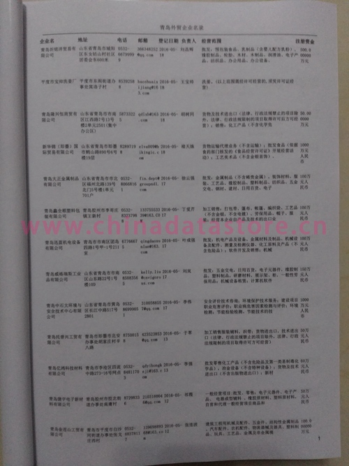 青島外貿(mào)企業(yè)黃頁(yè)包括:外貿(mào)企業(yè)名稱、地址、電話、傳真、郵箱、經(jīng)營(yíng)范圍、注冊(cè)資金等信息。