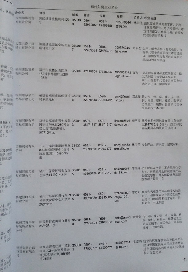 福州外貿(mào)企業(yè)黃頁(yè)包括:外貿(mào)企業(yè)名稱(chēng)、地址、電話(huà)、傳真、郵箱、經(jīng)營(yíng)范圍、注冊(cè)資金等信息。