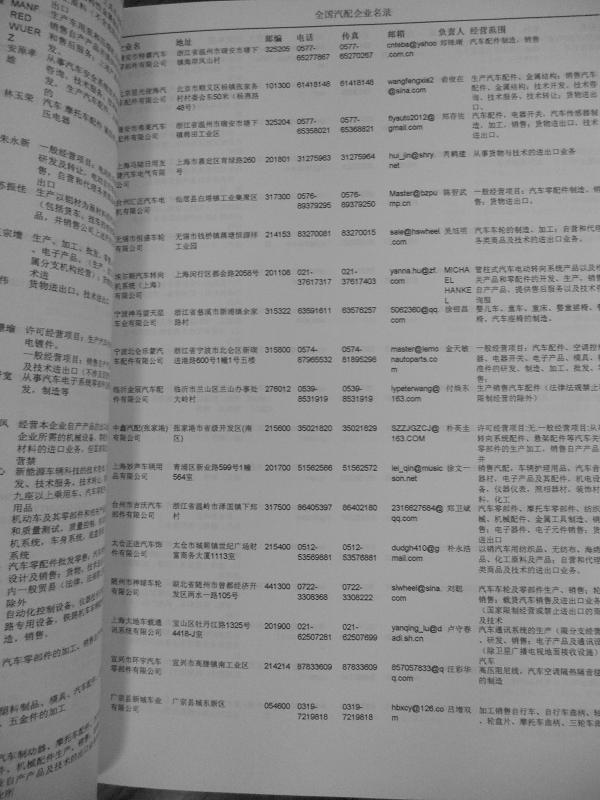汽車配件外貿(mào)企業(yè)黃頁包括:外貿(mào)企業(yè)名稱、地址、電話、傳真、郵箱、經(jīng)營范圍、注冊資金等信息。