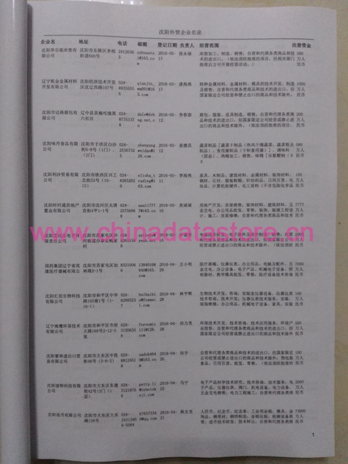 沈陽外貿(mào)企業(yè)黃頁包括:外貿(mào)企業(yè)名稱、地址、電話、傳真、郵箱、經(jīng)營范圍、注冊資金等信息。