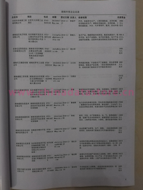 湖南外貿(mào)企業(yè)黃頁(yè)包括:外貿(mào)企業(yè)名稱(chēng)、地址、電話(huà)、傳真、郵箱、經(jīng)營(yíng)范圍、注冊(cè)資金等信息。