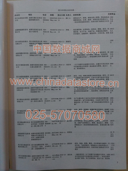 四川外貿(mào)企業(yè)黃頁包括:外貿(mào)企業(yè)名稱、地址、電話、傳真、郵箱、經(jīng)營范圍、注冊資金等信息。