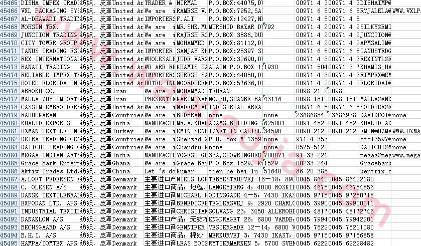 紡織、皮革、羽絨采購商名單數(shù)據(jù)為Excel格式,信息可任意修改、復(fù)制、打印、導(dǎo)出及導(dǎo)入到傳真、郵件群發(fā)等軟件中,無任何限制。