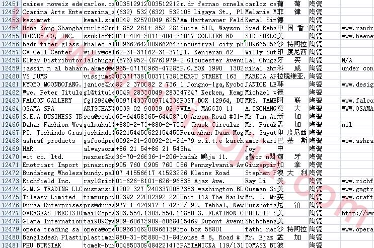陶瓷采購商名單數(shù)據(jù)為Excel格式,信息可任意修改、復(fù)制、打印、導出及導入到傳真、郵件群發(fā)等軟件中,無任何限制。