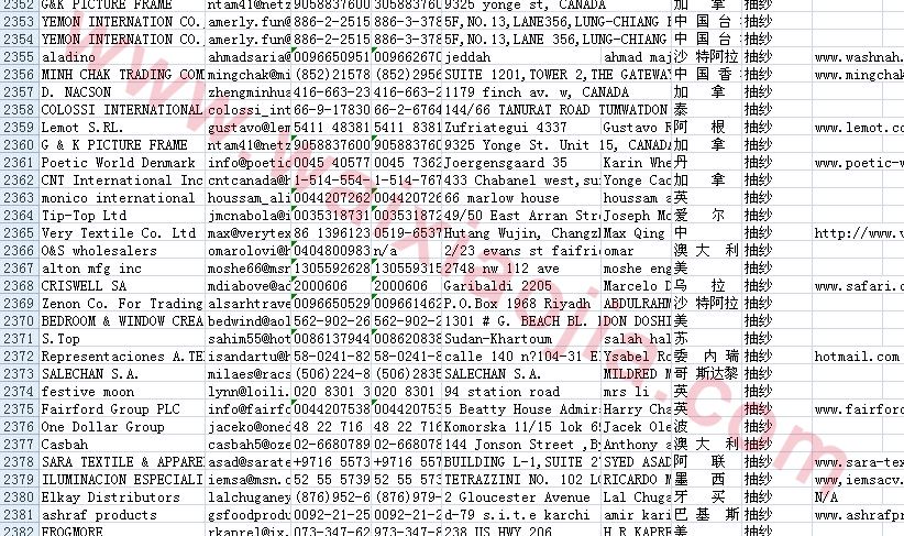 抽紗采購商名單數(shù)據(jù)為Excel格式,信息可任意修改、復(fù)制、打印、導(dǎo)出及導(dǎo)入到傳真、郵件群發(fā)等軟件中,無任何限制。